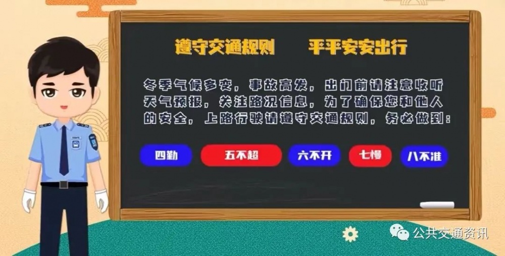 冬季氣候多變,事故高發(fā),出門前請注意收聽天氣預(yù)報(bào),關(guān)注路況信息,為了確保您和他人的安全, 上路行駛請遵守交通規(guī)則,務(wù)必做到:四勤、五不超、六不開、七慢、八不準(zhǔn) 。