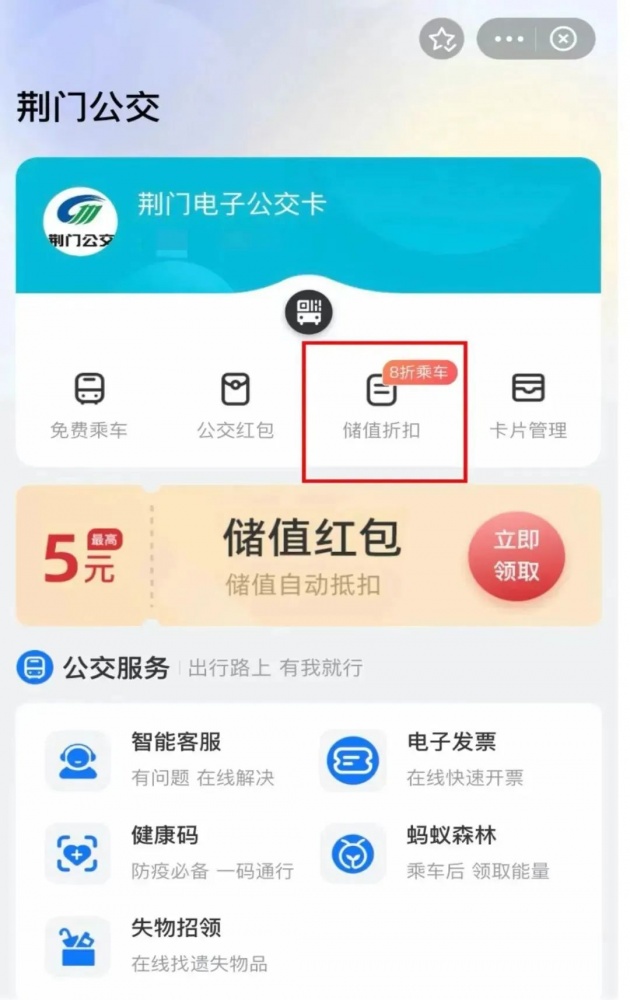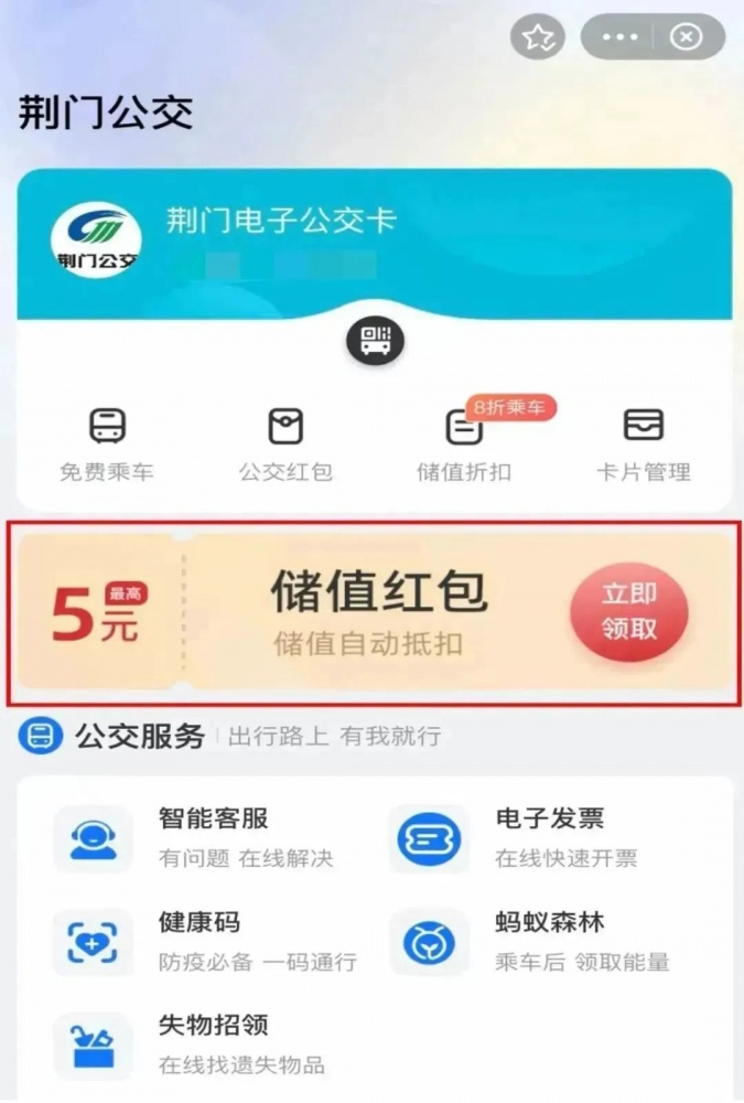 02點擊“荊門公交”,領(lǐng)取“儲值紅包"后點擊【去優(yōu)惠充值】,完成優(yōu)惠儲值