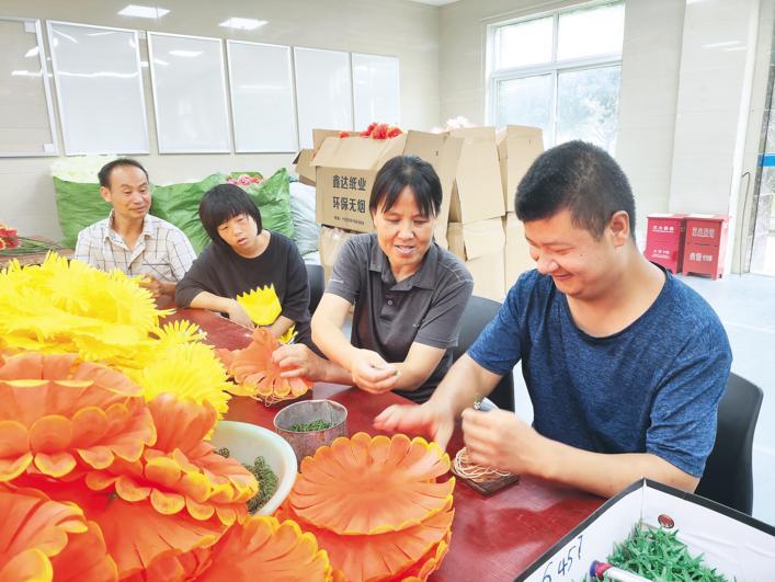 荊門市圓夢殘疾人庇護工場內,孟麗華(右二)正教殘疾朋友進行手工制作。