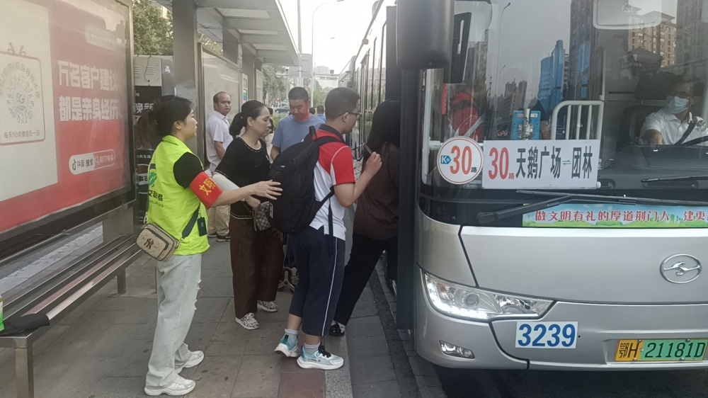 開(kāi)學(xué)當(dāng)天,人流大、車輛多,在城區(qū)各個(gè)學(xué)校附近,公交志愿者身穿綠馬甲或是佩戴安全袖章,守候在關(guān)鍵路口、站臺(tái)和斑馬線,面帶笑容引導(dǎo)學(xué)生安全出行。